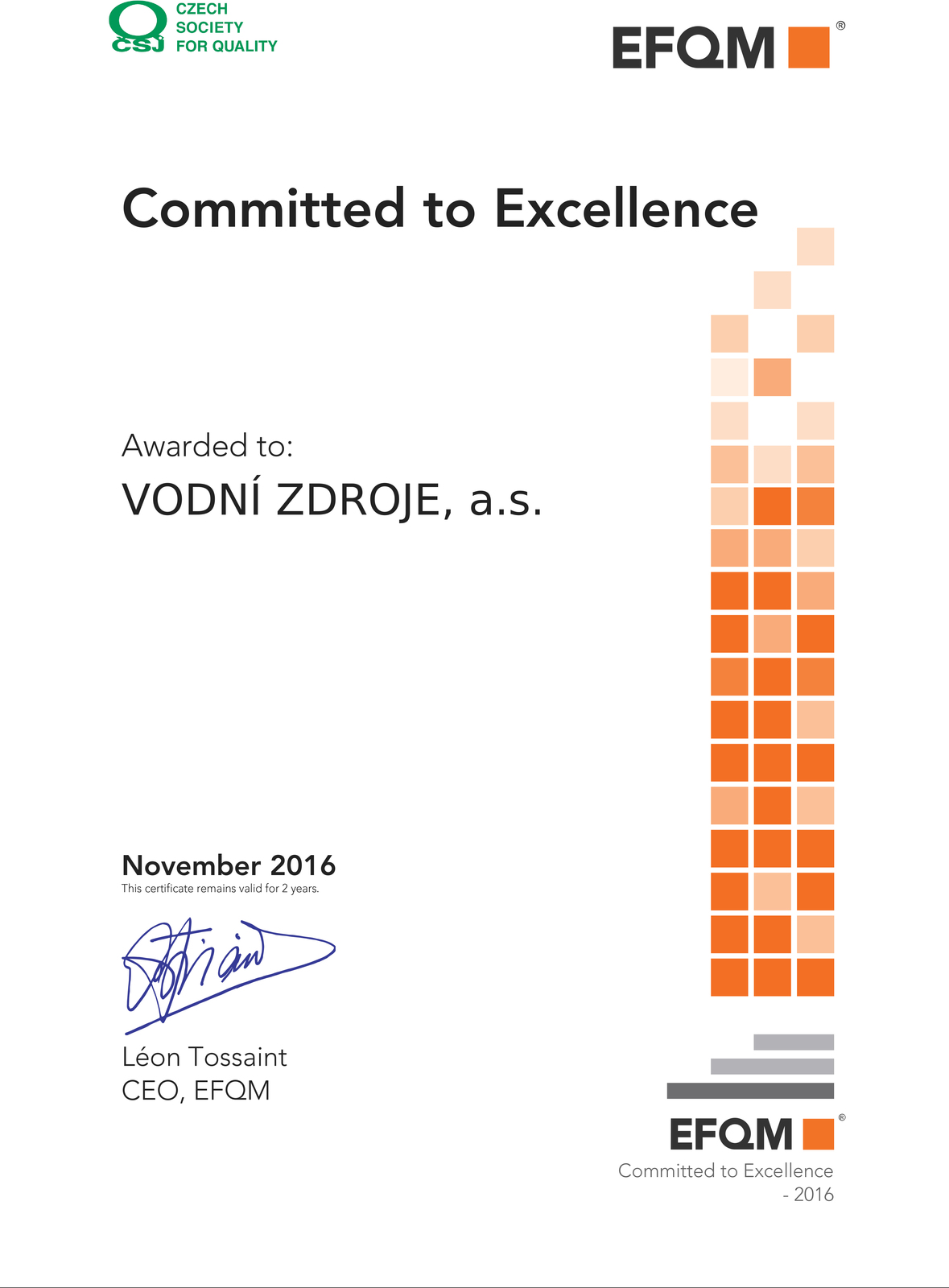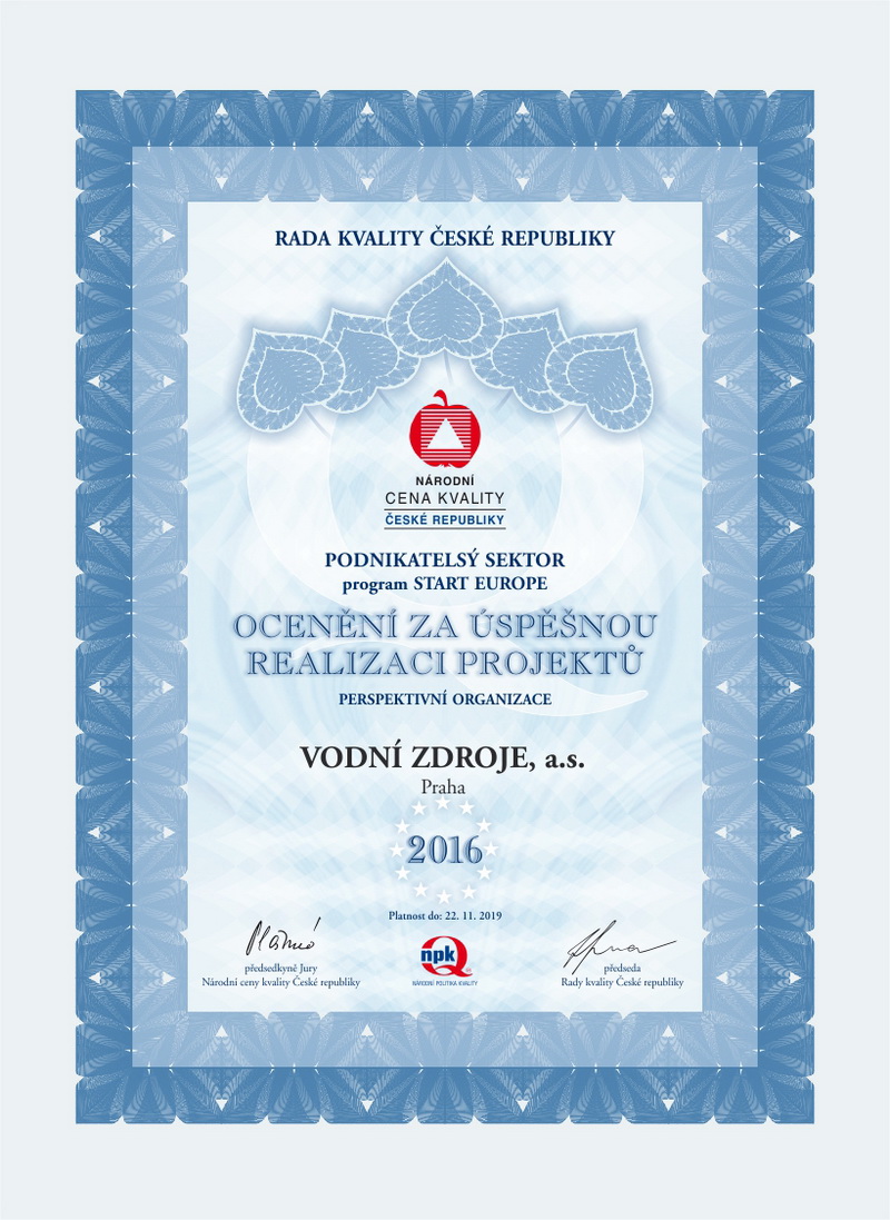 Společnost VODNÍ ZDROJE, a.s. získala za rok 2014 a 2016 ocenění Perspektivní organizace v programu Národní ceny kvality ČR.
