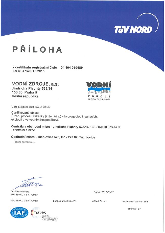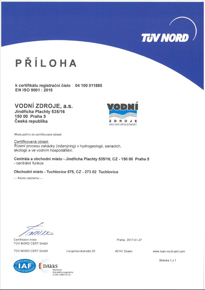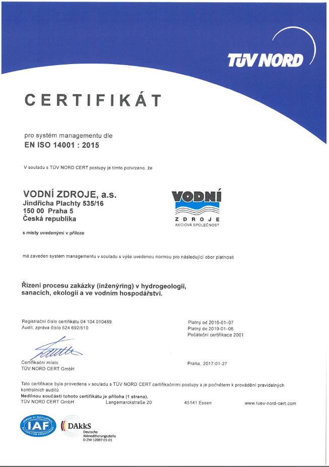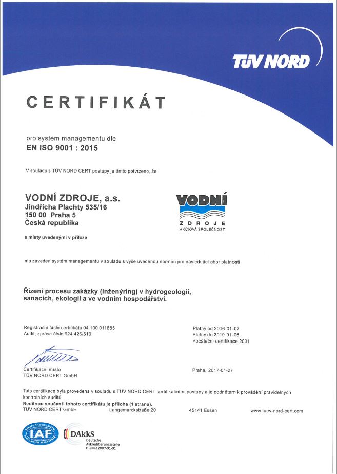 V současnosti je společnost VODNÍ ZDROJE, a.s. certifikována společností TÜV NORD Czech, s.r.o.